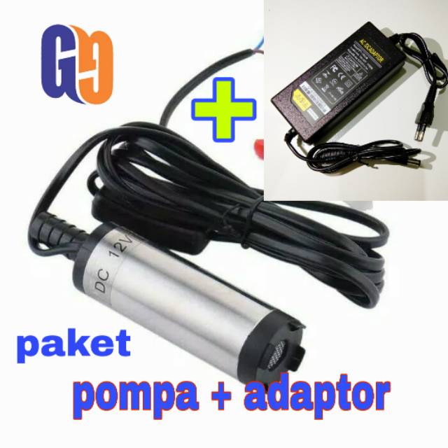 paket pompa + adaptorPompa Celup serbaguna, berukuran mini dengan motor yang kuat dan kencang, terbuat dari Stainless Steel, PVC dan Waterproof: aman utk air konsumsi, solar dan cairan lainnya.Banyak dipakai utk:1. Menguras akuarium2. Mencuci mobil, motor dan AC3. Menyiram bunga dan tanaman4. Jualan minyak tanah eceran5. Boat dan perahu yg kemasukan air6. Mengisi solar dari jerigen/drum7. Kran air Reservoir/WC umum Portable8. Dispenser/galon air tanpa listrik PLN9. Menguras genangan air akibat banjir10. Bisa dikombinasikan dgn Arduino utk otomatis11. dan masih byk fungsi lainnyaPower supply cukup 12v DC dari:1. Aki/Accu2. Adaptor AC/DC3. Step Up dari batere Kotak 9v/186504. Step Up dari charger USB HP dll**Spesifikasi:Tegangan kerja: 12v DCKecepatan motor: max 8500 RPMArus motor: 0.2A - 1.5ADebit: 12 ltr/menitHead: 2.5mKabel: 0.3 mm2 x 3 mtrDiameter output: 16mmDiameter input: 38mm**Perhatian:- Jangan dipakai tanpa air- Jangan terbalik pemasangan positif dan negatif- pemakain nonstop max 30 menit. harus istirahat 5-10 menit. - bila tidak digunakan wajib diangkat dari cairan dan harus dibers