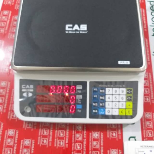 CAS - Price Computing PR-II 30EMerk : CASType : PR-II Capacity : 30kgWarranty : 2 yearsFeatures :- High Resolution for weighing {max 1/30.000}A maximum of 900 hours of battery life when used with Mn and Ph batteries together- Low profile Design Excellent applicability in open market with a low body- Hi/Ok/Low limit function - USB port for COMM & Power (option)- Price summation & pay function- Up to 7 direct plus memory function- LED display & Baclk light black- Rear display for customer (bench type)Spesifications:- Capacity : 30kg- Resolation : 1/3.000 - 1/30.000- Symbols : Stable, Zero, Tare, Battery remaining battery life indicated- Keys : NUMBER, ZERO, TARE, FUNCTION, MI-M7 KEY- Function : Direct PLU7, Unit conversion, power sleep mode, backlight mode, price summation and pay function.- Option : RS-232 (print, command), pole type, Mn battery, USB port- Power : 1.5v X 3units ID size battery or Pb battery 4v/4Ah - Dimensions : 330 (W) x 380 (D) x 150 (H)- Platter size : 330(W) x 235(D)MORE INFO :- - - - - - - - - - - - - - - - -Lokasi Toko ED SCALERuko Malibu blok i no.27(Komplek city resort residences boulevard)jakarta barat.cengkareng. tlpn: 02129526823 /087771177757/082112463333.website. www.timbangan jakarta.comNote :- Pengiriman diluar Jabodetabek Barang yang terdapat Aki, Batre dan Adaptor tidak di ikut sertakan . - Bersedia dialihkan ke expedisi lainnya jika terjadi kendala pengiriman- Garansi terhitung dari sejak pengiriman barang- Garansi batal jika barang fisik sudah tidak utuh, kabel, strain guage digigit tikus, loadcell bengkok, kena petir (kecuali waterproof/lighte