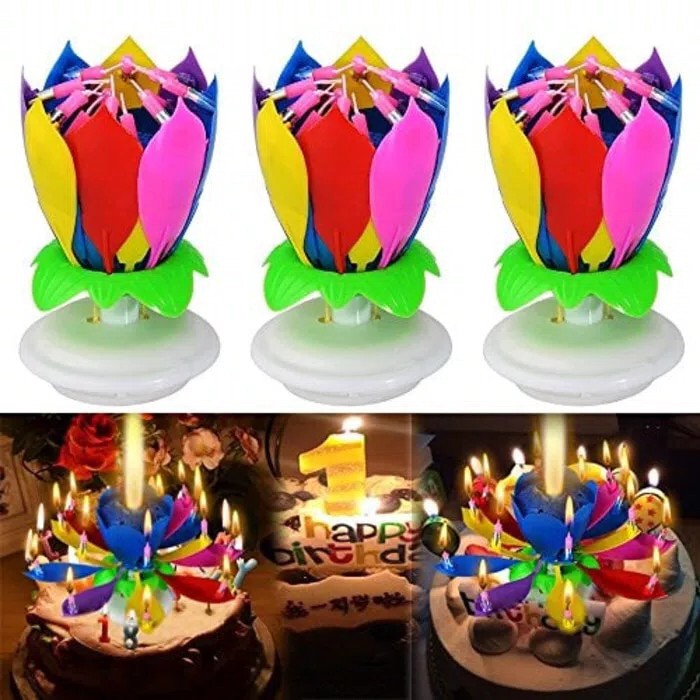 lilin ajaib yang akan mekar seperti bunga, mempunya kelopak dan mampu berputar diiringi lagu ulang t