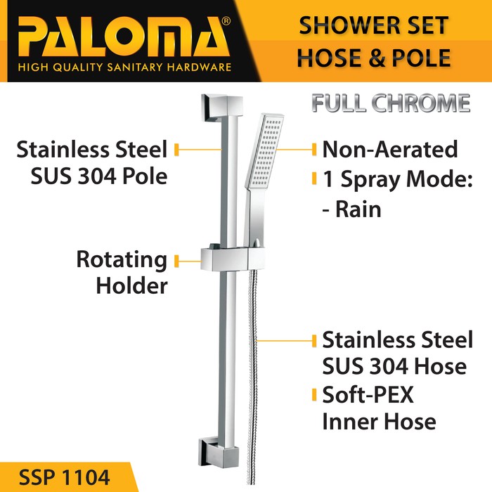 Set produk ini termasuk:1 x Handshower PALOMA1 x Flexible Hose PALOMA1 x Shower Pole PALOMAHandshower PALOMA:- Material: Hard ABS kualitas tinggi dan baru (bukan daur ulang / recycle). Padat, keras, dan sangat tahan lama. Anti-pecah dan anti-keropos. Tahan suhu air dingin dan panas tinggi. Anti-karat dan anti-korosi.- Titik-titik outlet air terbuat dari silicon elastomer (bukan plastic keras), tidak mengeras dan tidak getas. Mudah dibersihkan, sehingga tidak tersumbat kotoran dan kerak air. Semburan air selalu rapi dan terasa kuat.- Finishing chrome plated yang elegan, tebal, halus, dan jernih seperti cermin.- 1 mode semburan: Rain.Flexible Hose PALOMA:- Material outer jacket / selang bagian luar: Stainless Steel grade SUS 304 kualitas tinggi, kuat, anti-karat dan anti-korosi.- Struktur spiral double-interlock (bukan single), lebih kuat terhadap tarikan.- Material inner hose / selang bagian dalam: Soft PEX kualitas tinggi (warna transparant, bukan hitam). Tidak beracun. Tidak menimbulkan rasa dan bau pada air. Tahan suhu air dingin dan panas tinggi.- Material nut connector / mur penyambung: Brass (kuningan) kualitas terbaik. Lebih tebal dan tidak mudah retak. Anti-karat dan anti-korosi.- Finishing chrome plated yang elegan, tebal, halus, dan jernih seperti cermin.- Panjang 150 cm.Shower Pole PALOMA:- Material: Stainless steel SUS 304 kualitas tinggi. Anti-karat dan anti-korosi.- Holder dapat dinaik-turunkan, untuk mengatur ketinggian handshower.- Holder dapat diputar secara vertikal, untuk mengatur arah semburan handshower.- Termasuk baut dan fischer untuk pemasangan ke dinding.Pasangan keran mixer (panas dingin):- FCP 2501- FCP 2301Pasangan keran non-mixer:- FCP 6276- FCP 6376- FCBZ