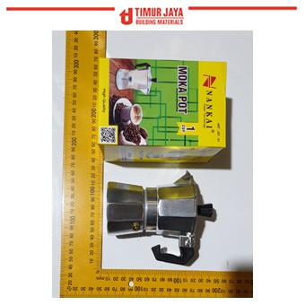 Moka Pot 1 Cup NankaiDengan Material AlmuniumWarna SilverKapasitas 1 Cup -/+ 45mlCara penggunaan :1. Putar bagian tengah moka pot, lalu masukkan air pada bagian dasar2. Kemudian pasang corong saringan lalu isi dengan kopi bubuk3. Tutup kembali moka pot, sehingga posisinya air di bawah dan kopi di tengah4. Mulai proses pembuatan dengan meletakkannya diatas kompor4. Setelah cukup panas, air akan mengalir naik ke atas5. Kita dapat menikmati kopi nikmat pekat tanpa ampasUntuk mendapatkan hasil yang sempurna dari moka pot disarankan memakai biji kopi fresh roast, dan dengan hasil gilingan setera dengan espresso atau bisa juga dengan sedikit lebih kasar dari esp
